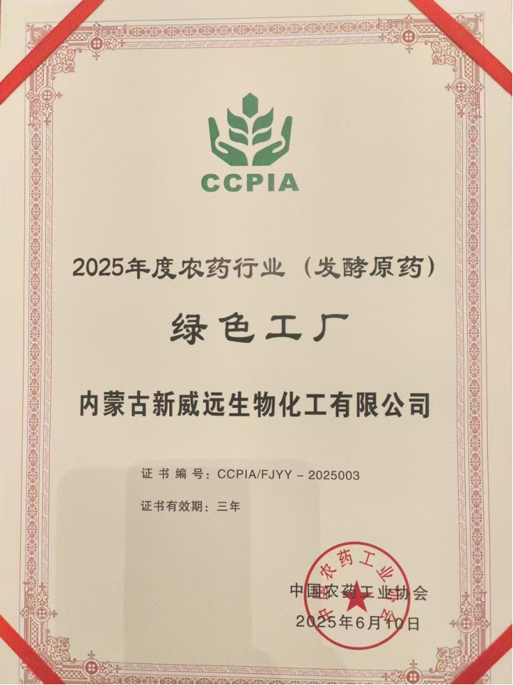 2025 年 6 月,经企业自主申报、形式审查、专家评审、公示等程序,利民股份(002734)子公司新威远通过严格评审与层层筛选,荣获中国农药工业协会评选的“2025年度农药行业绿色工厂(发酵行业)”荣誉称号。